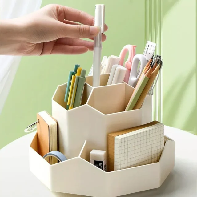 Wave goodbye to cluttered spaces with this innovative 360° Rotating Desk Organizer! Designed with versatility and convenience in mind, it serves as the perfect companion for both your cosmetics and stationery needs. Its sleek rotating base allows easy access to all your essentials, ensuring that your productivity and organization go hand-in-hand. Whether it’s for office supplies, makeup essentials, or even as a chic holder for your living room, this organizer is crafted to cater to all your storage needs with style and efficiency.