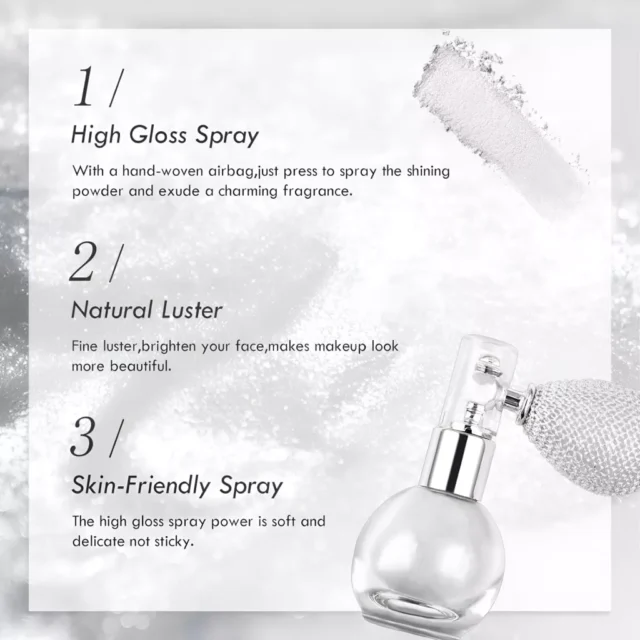 This highlighter powder spray is fantastic. it’s so easy to apply and gives a stunning shimmer that looks great on both face and body. the glitter is fine and gives a lovely glow without being too flashy. i love how it enhances my makeup and makes my skin look luminous. it also lasts a long time and doesn’t wear off quickly. it’s perfect for special occasions or when you just want to add a bit of sparkle to your day. i’m really pleased with this purchase and would highly recommend it to others.
