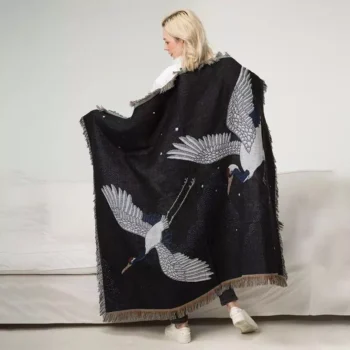 Elegant Black Crane & Floral Japanese Knitted Cotton Blanket